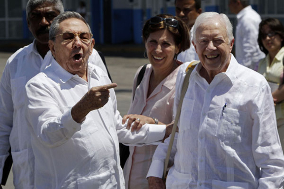 En su segunda visita a La Habana ahora en marzo del 2011, Carter ha reclamado desde allá hoy en la conferencia de prensa que ofreció como colofón a su periplo, el levantamiento del embargo, ha exigido que los norteamericanos viajen a Cuba sin restricciones, que el régimen castrista sea sacado de la lista de países que aupan el terrorismo, y que los cinco criminales cubanos que atentaron contra la seguridad de Estados Unidos y que están presos aquí sean liberados porque no tuvieron un juicio justo. Al mismo tiempo, no hizo nada para traer de vuelta a su conciudadano Alan Gross, encarcelado injustamente en Cuba. Qué pena… sólo olvidó pedirle al Vaticano que canonizaran en vida a Fidel Castro.