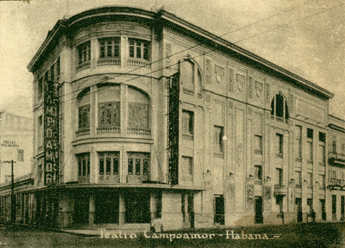 El 20 octubre de 1921, los empresarios Santos y Artigas —dueños del circo más importante de Cuba— inauguran el teatro Campoamor, en Industria y San José, construido a un costo de 300 mil pesos de la época. Pero después comenzó a usarse como cine. Allí se realizó la premiere el 15 de febrero de 1928 del filme The Jazz Singer, la primera película sonora, de 1927, estrenada en Estados Unidos prácticamente semanas antes, el 6 de octubre de 1927. |
