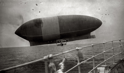 Después de más horas navegando a la merced del viento y con una distancia recorrida de 1370 millas, Wellman y sus hombres avistaron el vapor inglés Trent al Oeste de Bermuda, con el que trataron infructuosamente de comunicarse a través del código Morse. Entonces no les quedó más remedio que abrir la válvula de escape para el gas y descender sobre la mar en el bote salvavidas del que, afortunadamente los recogió el Trent, incluido al perro Kiddo, que viajaba con ellos. Desde el navío salvador fotografiaron al America en apuros. |