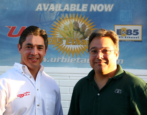 En la mañana del 13 de septiembre del 2007, el editor de este website cubrió para el noticiario matutino de Radio Caracol 1260 AM, en Miami, Florida, que dirigía el colega Jaime Flórez, la inauguración de la primera bomba de etanol en la estación de servicio U-Gas, de Urbieta Oil, en la calle Flaggler y la 79 Ave., en la Capital del Sol, frente al célebre Mall de Las Américas. En la instantánea que viene a continuación, Edwin Flores [der.], presidente de Urbieta Oil, y Alex Vitale, vocero de General Motors para los medios en la región del Sudeste, en la citada apertura. En aquel momento, GM lidereaba el segmento de la tecnología flexible de combustible, con 14 modelos de vehículos de este tipo.