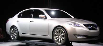 Aunque desde el principio Hyundai identificó al prototipo como Genesis, advirtió que acaso ése no sería su nombre definitivo, pero sí aclaró que, como hizo VW con el Phaeton, tampoco renunciaría a su nameplate cuando participara en la categoría de lujo, a diferencia de Toyota, Nissan y Honda, que bautizaron a sus divisiones de distinción con otros nombres (Lexus, Infiniti y Acura, respectivamente). Pero sin embargo Hyundai —que a la larga terminó quedándose con el nombre tentativo de Genesis— estaba estudiando cuidadosamente cómo no repetir la metedura de pata de Volkswagen, que mantuvo no sólo el contradictorio nombre de la firma, sino el logo al frente del coche. Y ese riesgo la marca coreana, sabiamente, no estaba dispuesta a correrlo. Así que la primera vez que el coche fue presentado en un salón de exhibición la compañía ensayó el efecto mostrando una unidad con un grill incluyente de la H inclinada que representa a la marca y otro sin ella y, finalmente, optaron por la parrilla de 3 barras horizontales (Mercedes usa 3 ó 4 dependiendo de la clase), donde no se lee el nombre ni se ve el logo en la careta, de manera que se parece a un M-B cuyo círculo divido en tercios se le hubiese desprendido.