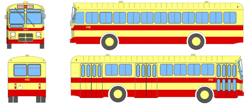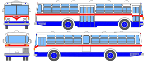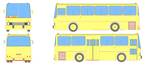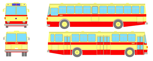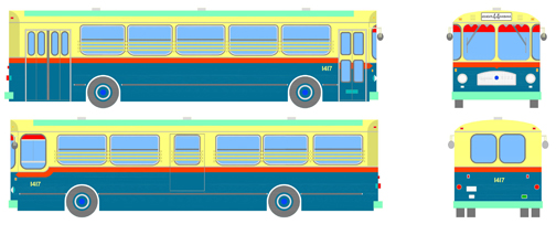 Este esquema demuestra el patrón de color del primer Giron XII, de tres puertas. El siguiente, el de dos, con distinto color. El autobus matrícula 5054 que ingresó a la Embajada de Perú era rojo y crema, pero al ser reconstruido fue repintado en azul-verde y crema. |
