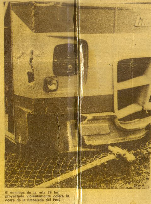 Esta es una foto de la prensa cubana de la época que muestra el autobús balaceado en los predios de la sede diplomática. |