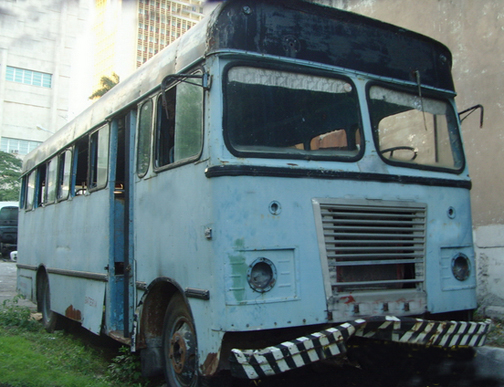 Esta es la imagen de una de las primeras ediciones del autobus Girón, ahora abandonado. Un endiablado cajón metálico con ventanillas y 20 años de atraso en su mismísimo parto... |