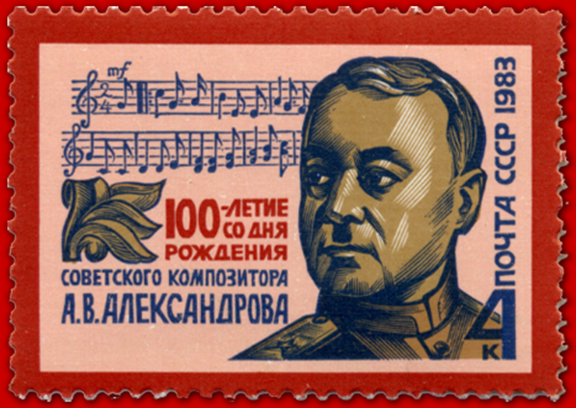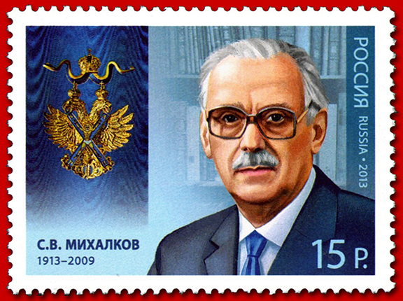 | Este sello ruso del año 2013, celebra a Serguei Mikhalkov, autor de la primera letra del Himno Soviético en 1944, y también de la segunda, una revisión de la original en el 2000 a órdenes de Vladimir Putin. Entonces Mikhalkov tenía ya 96 años. En la imagen debajo, otro sello conmemorativo, de 1983, en la era soviética, dedicado a Alexander Alexandrov , compositor de la música. |