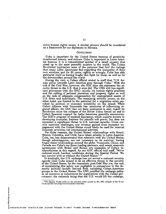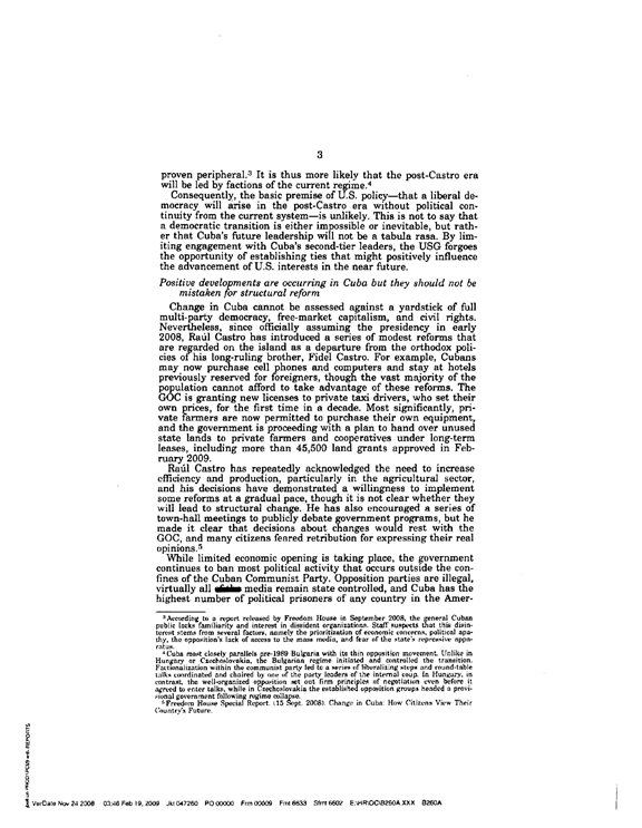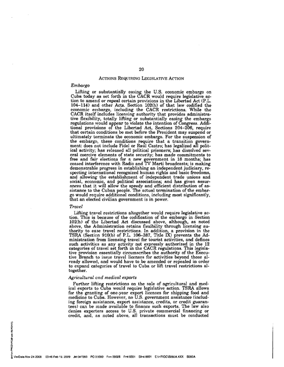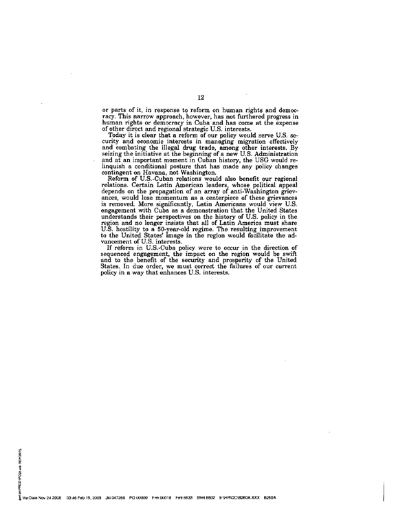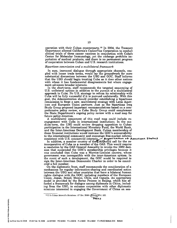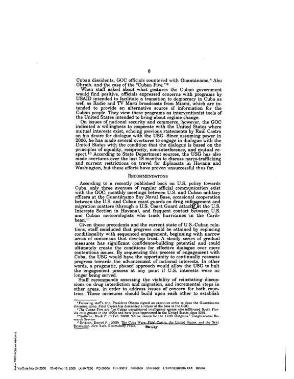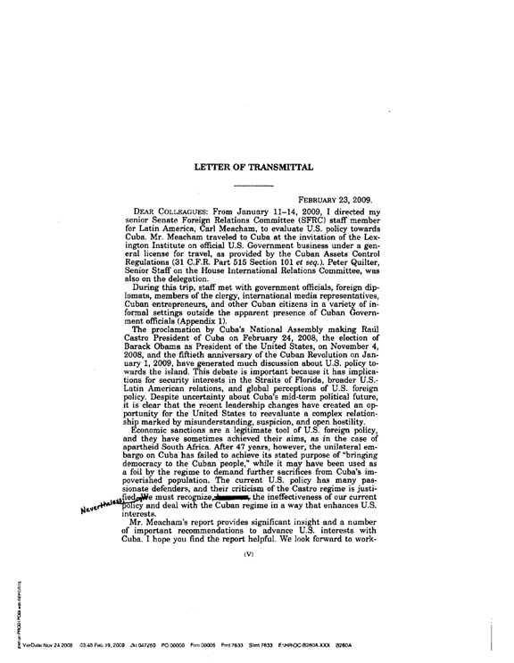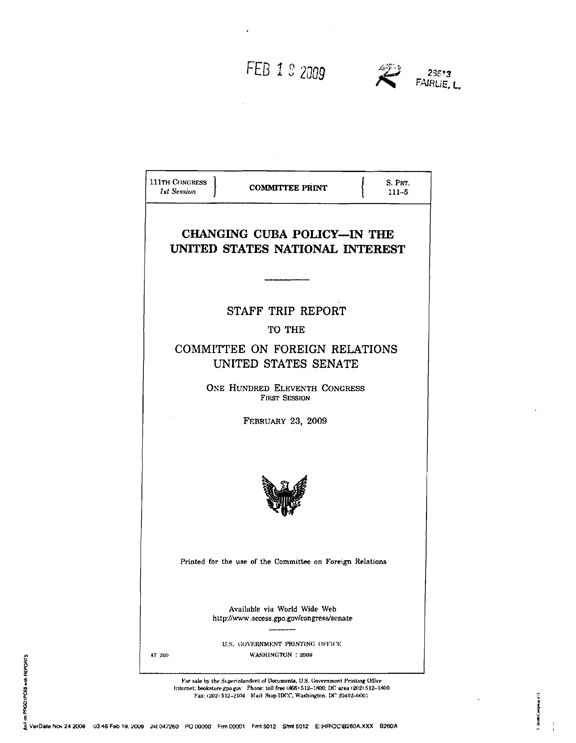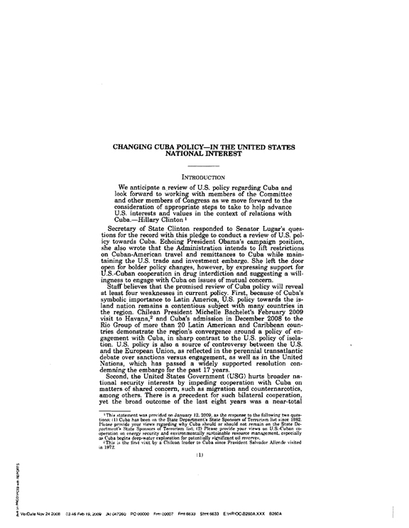 Facsimil del documento de 25 páginas titulado Changing Cuba Policy in the United States National Interest ("Cambiando la Política hacia Cuba en el Interés Nacional de los Estados Unidos") del senador republicano por el Estado de Indiana Richard Lugar, además Presidente del Comité de Relaciones Internacionales del Senado, presentado el 23 de febrero del 2009, que nace de las observaciones in situ que dos enviados por él hicieran recientemente en La isla y que en consecuencia arrojó esta propuesta de nuevo rumbo a las relaciones de Estados Unidos con Cuba y que contempla la abolición o un relajamiento dramático del embargo hacia el vecino pais comunista.
