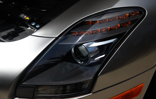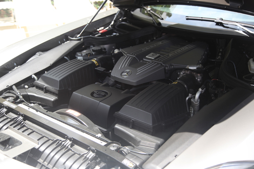 | El vehículo encarna todo lo que se espera de un genuino auto deportivo de cima. Cuenta con un motor V-8 de 6.2 litros de 32 válvulas que genera 563hp y 479 libras por pie de torsión a tan solo 4750rpm. El motor está ubicado bajo y bien adentro, muy por detrás del eje delantero para una distribución de peso delante-detrás de 48/52%, casi perfecta para su proyección dinámica. Sin embargo, a pesar de adentrado, la ubicación de la planta motriz hace del SLS todavía un front/mid engine car. |