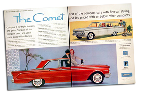 Así pues, el Comet fue la versión de Mercury del Ford Falcon, el compacto por excelencia de Ford en la era en que Studebaker (el Lark) y Chevrolet (el Corvair) ensayaban autos más reducidos en talla a finales de los años 50. El término “compacto” fue acuñado por George Romney —el padre del pre-candidato presidencial Mitt Romney— a la sazón presidente de American Motor Company, que había puesto en el mercado un vehículo del corte, el Rambler.