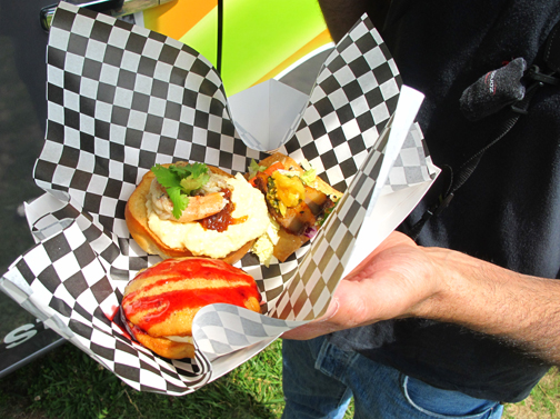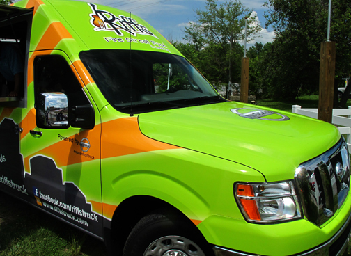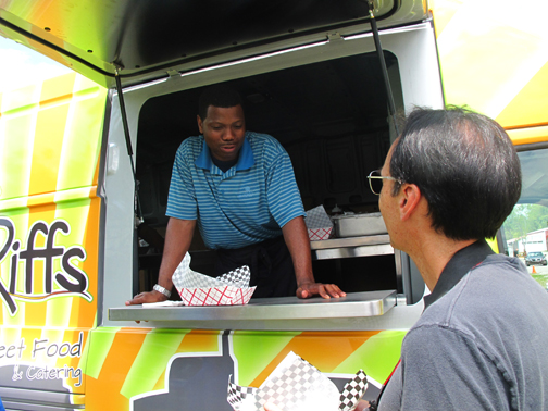 | Esta imagen y las dos en específico a continuación, corresponden al alto en la ruta de prueba para hacer el cambio de conductor, que ocurrió en el pobladito de Bell Buckle. Allí nos esperaba Riffs, este food truck de esa tendencia tan en boga hoy día. El chef, que confecciona unos platillos locales según "receta de la abuela" y con los que nos agració a los periodistas del evento, está orgulloso de emplear para su negocio un Nissan NV. |