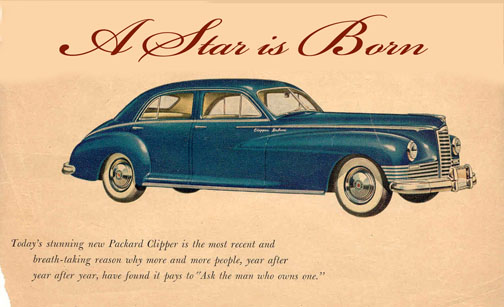 Pero el caso es que en 1946, además del citado show, nacieron dos estrellas; una, Liza Minelli —que es la mejor obra de la Garland— y, dos, el Packard Clipper de ese año. No exagero en lo de la estrella naciente aplicado al carro; es que muchos de los anuncios publicitarios del coche entonces eran encabezados con la frase A Star is Born (nace una estrella).