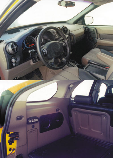 Producido en la planta de Ramos Arizpe en México —de ahí probablemente su nombre de “Azteca”— el Aztek es un vehículo concebido específicamente para el estilo de vida dinámico de la Generación X. Aztek es una invitación al uso. Y a escaparse. A acampar a cielo abierto. Su cladding o panelería plástica —resistente a roces severos– que prácticamente lo envuelve todo es una declaración certificada de espíritu aventurero. El área de carga ofrece un contenedor desmontable y radio independiente —10 speakers en total—, ideales para tailgate parties. Una serie de configuraciones para la diversión outdoor complementan el paquete de campaña, que ofrece una tienda y una cama de aire para dos. La consola central, que también puede ser removida, es un cooler o nevera que alberga 12 latas. En fin, el concepto interior es á la Indiana Jones contemporáneo, una suerte de vehículo tipo Discovery Channel.