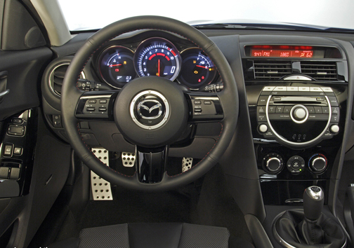 El interior de RX8 no es exactamente un salón de ceremonias; más bien, es opresivo, sensación que se acentúa precisamente de los hombros hacia arriba —me recuerdo estar dentro de un MG de 1955 con la capota cerrada—. Un conductor de 6 pies de estatura no estaría muy de plácemes dentro del 8.