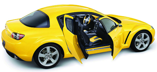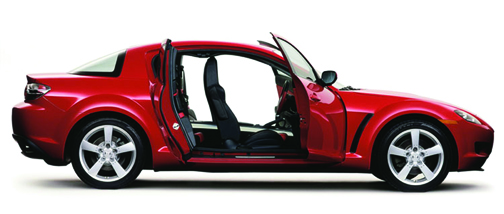 El RX8 es de cuatro puertas simétricas —o suicide doors, si prefiere la definición arcaica—. Se trata de una solución tan antigua como de los años 20 aunque de configuración al revés inicialmente— y que luego tuvo un comeback en los 40 —con la estructura sostenida hasta hoy— y posteriormente en los 60, cuando se hicieron presentes en algunos sedanes norteamericanos de gran talla. Esta forma de puertas que se besan en sus bordes, comenzó a regresar a mediados de los 90 en algunas pick-ups de discretas cabinas extendidas y, en los autos, en el Saturn, aunque de un solo lado. Normalmente, estas puertas son antiestéticas. Dicho menos eufemísticamente: feas. Mas no así en el RX8, muy bien diseñadas y rigurosas en el cierre. Es una solución inteligente para facilitar el acceso y egreso sin afear el diseño general de un automóvil que "debería" ser de dos puertas. Y tal vez aquí radique la máxima virtud de estas hojas: que a pesar de ellas, el coche luce se visualiza como un cupé —al contar con 4 puertas, 'moralmente' no habría de calificar para la definición. |