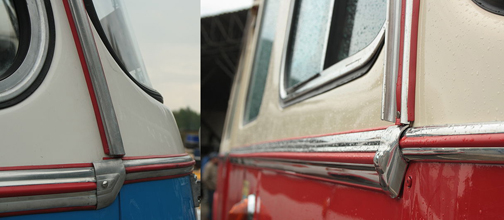 Un detalle de diseño interesante del RTO era esta solución para enmascarar los tornillos. Todas las líneas de tornillos tanto dentro como fuera del autobús, se apoyaban en un larguero de aluminio acanalado, cubierto por una cinta de goma roja de corte transversal semicircular. Por alguna razón incomprensible, algunas personas se dedicaron a arrancar la tira de caucho y, en unos años, todos los tornillos quedaron al desnudo. |
