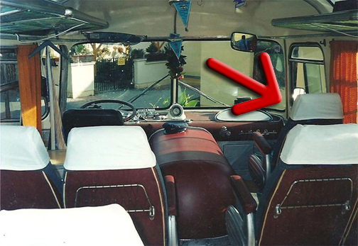 Debo haberme sentado en todos los asientos de los Skoda, y viajé en ellos en toda hora, día clima y circunstancia: en invierno, en verano, con frío y con calor, con lluvia y con sol, de día, de noche y hasta de madrugada. Y claro que como niño, especialmente amante de los autobuses, me afanaba por hacerme del asiento delantero al mismo nivel del parabrisas que el chofer, a su derecha, como señala la flecha en la foto inmediata: |