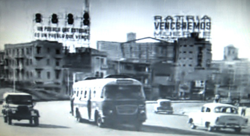 El RTO en su salsa política: Por su baja resolución, esta imagen que hallamos en la internet, probablemente sea un fotograma de un registro fílmico. La escena es en La Habana, de seguro en la primera mitad de la década de los 60, cuando la capital cubana ya había sido estalinizada. Nótese que las estructuras sobre los edificios otrora anuncios comerciales, han sido convertidos en lumínicos de propaganda ideológica. Circulando a la derecha del bus, un "jeep" soviético UAZ 69, semejante a los que Castro usaba para desplazarse entonces. (Los lumínicos rezan, PATRIA O MUERTE, VENCEREMOS y, UN PUEBLO QUE ESTUDIA ES UN PUEBLO QUE VENCE). |