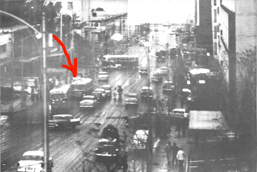 Esta fotografía de La Rampa es de 1963. Nótese señalado con la flecha roja un Skoda que bien podría ser de la ruta 22. Los otros dos autobuses que se aprecian en la instantánea son GM. |