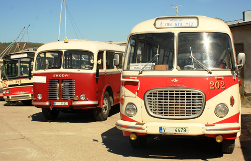 En esta imagen de un museo en la República Checa, se observan tres generaciones de buses Skoda: En primer plano el RTO MTZ, en el centro, el RO original y, a la extrema izquierda del lector, el modelo de 1967. |