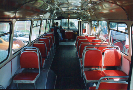 Las dos fotografías del interior del RTO urbano son de un modelo especial europeo, carente de asideras en el techo, de la barra horizontal que cruzaba los cristales traseros, y de la puerta de atrás. Pero sí comparten la configuración de 4 asientos en dupletas, lo cual estrechaba el pasillo. |