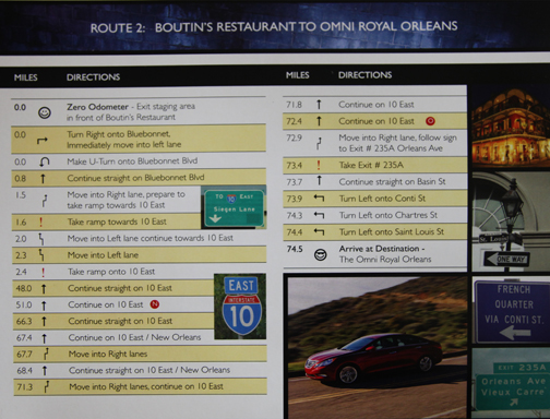 Al día siguiente, probamos el auto desde New Orleans hasta Baton Rouge, ambas ciudades distantes unas 70 millas entre sí. En la mañana temprano, tras el breefing tecnico con Michael Deitz, abordamos los autos aparcados frente al hotel, y cruzamos el barrio francés no a pie como la víspera, sino a bordo del Sonata para emprender la ruta de prueba. |