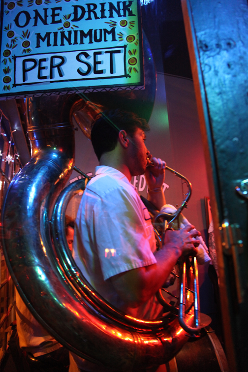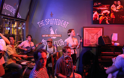 Tras la cena, también a pie, nos encaminamos a la infamemente para algunos célebre calle Bourbon —con el propósito de mejorar la digestión, no de portarnos mal, dicho sea de paso—. Pero ni santos ni pecadores, nos topamos con un delicioso club de jazz, The Spotted Cat, en la Calle Frenchmen, donde tocaba una banda tradicional local, con todo el sabor que sólo se puede hallar en New Orleans. |