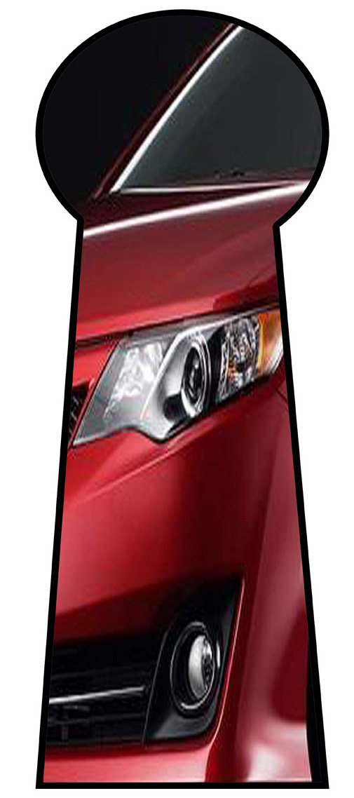 Posted Aug.3/2011 • Toyota reveló el miércoles 3 de agosto una fotografía de su próximo Camry para el 2012, totalmente rediseñado, que muestra únicamente la esquina delantera derecha del coche, dominada por la lámpara. Como también se observa la luz neblinera, se especula que esta foto es la del modelo superior. Tan sólo este atisbo como a través de una ranura, indica que el carro viene seriamente cambiado respecto del modelo que todavía está en el mercado.