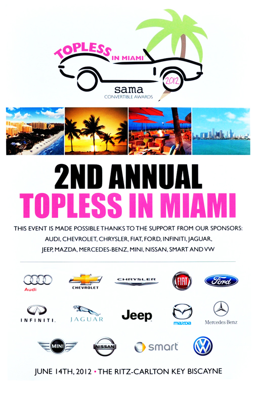 | El jueves 15 de junio del 2012 se celebró por segunda vez Topless en Miami, este evento organizado por SAMA (Southern Automotive Media Association), la organización que reúne a los periodistas de automovilismo de esta región. |
