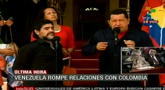 Estaba loquito por hacerlo. Chávez. Romper relaciones diplomáticas con Colombia. Y lo acaba de hacer. Públicamente, en la televisión, enunciando las decisiones del gobierno en tanto que política de estado frente a una cámara y un micrófono, tal cual aprendió del mentor que escogió para sí, Fidel Castro. A su lado, atento, con inusitada mezcla de despiste y atención —como quien no entiende ni un pepino—, estaba Diego Armando Maradona, con su cara de simio estupefacto —¿estúpido de facto?—, el homúnculo más breve del mundo, el que se termina en las choquezuelas, pues de éstas hacia arriba, nada…